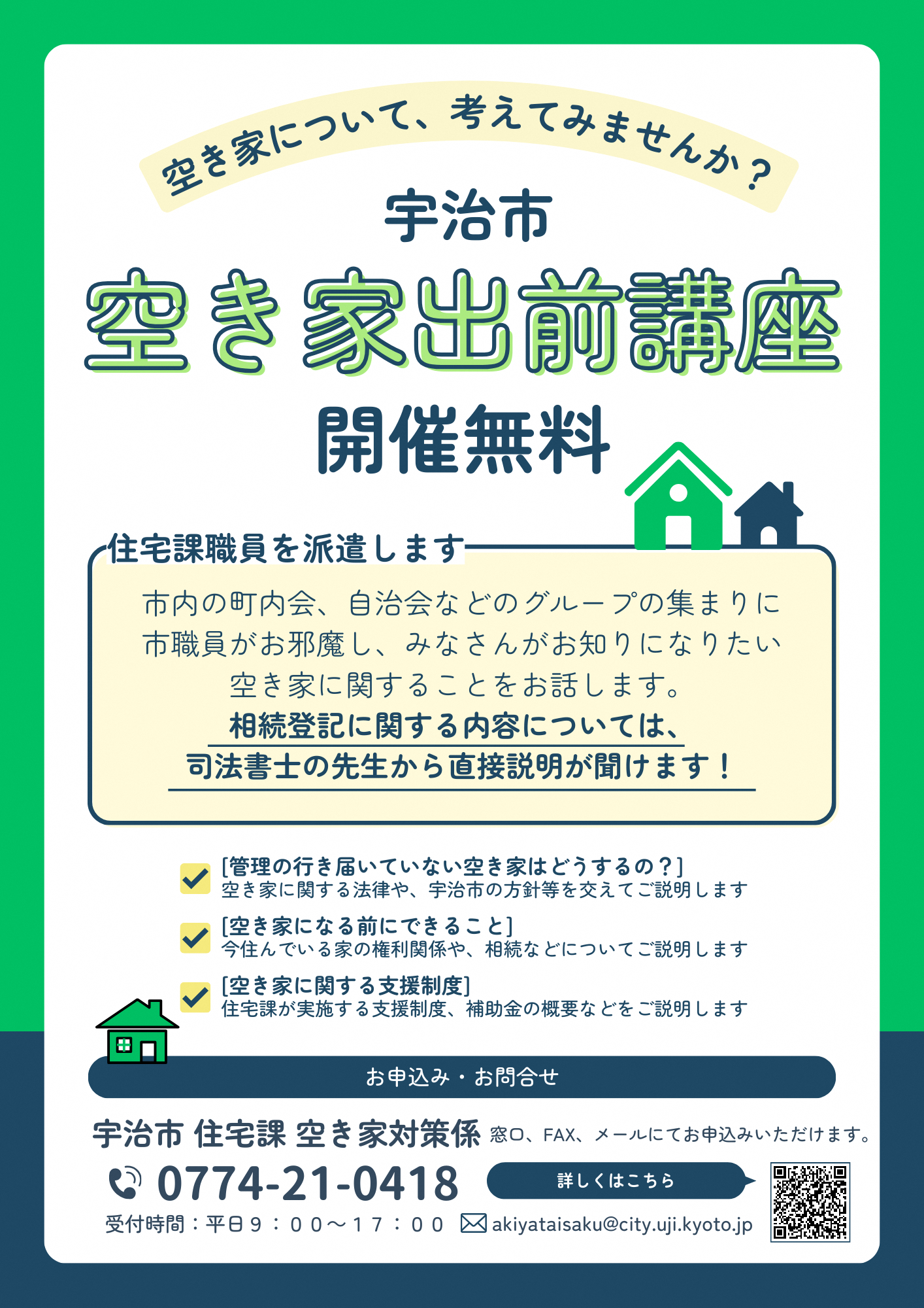 宇治市では、住宅課職員が直接市民のみなさまの集会等にお邪魔し、空き家に関する講座を実施させていただきます。